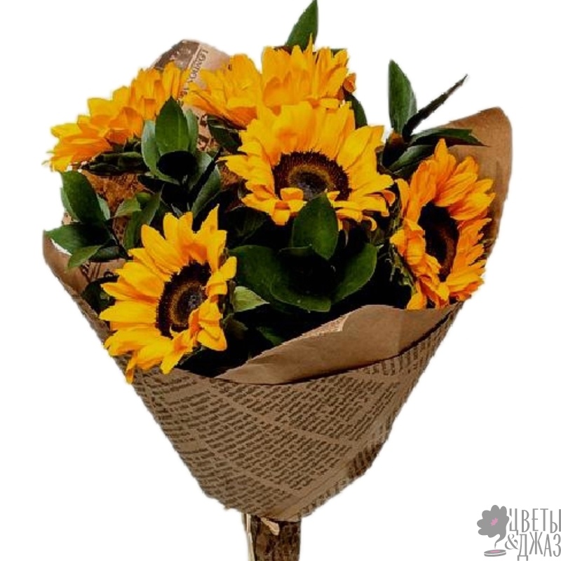 Букет состоит из 5 подсолнухов, зелень, крафт, атласная лента.