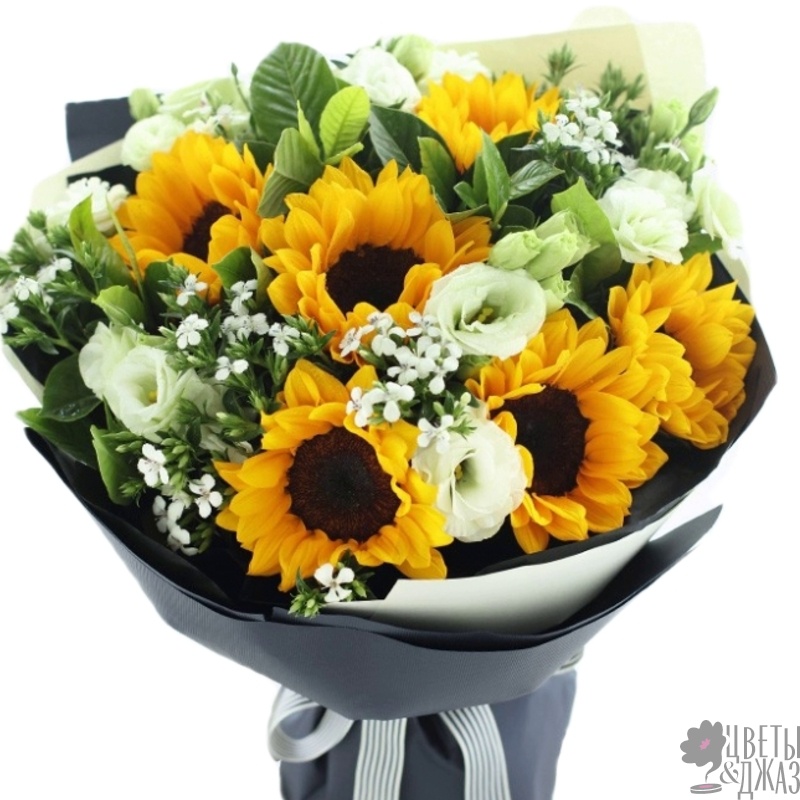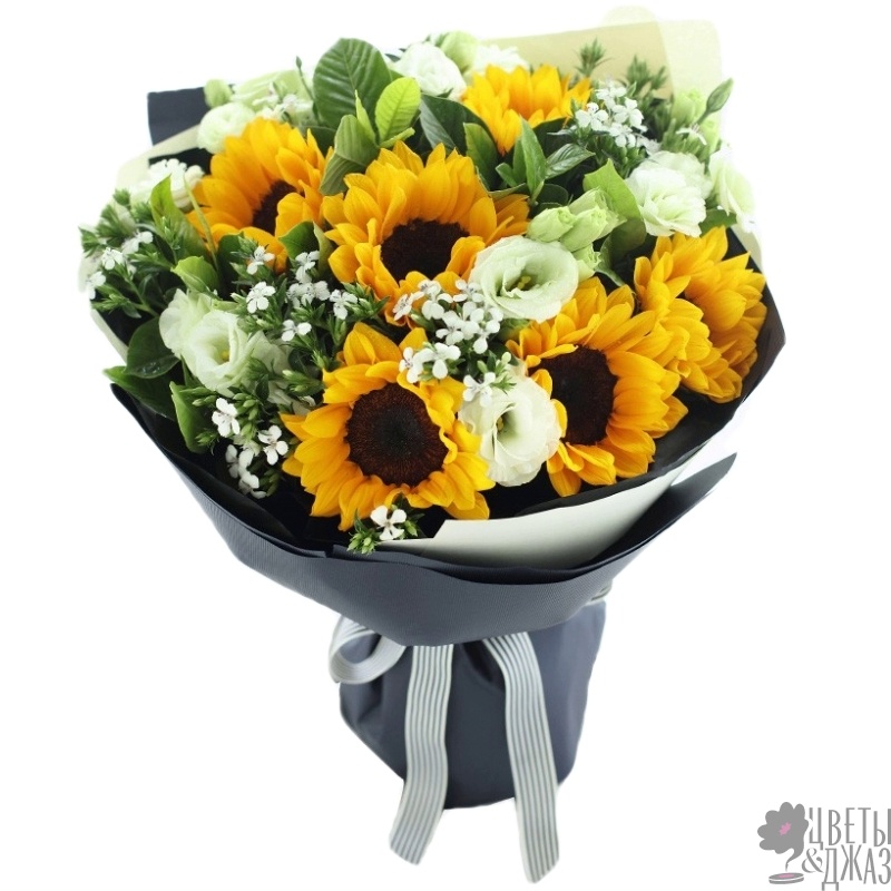 Букет состоит из 7 подсолнухов, 6 веток эустомы, декоративная зелень, красивая упаковка, атласная лента.