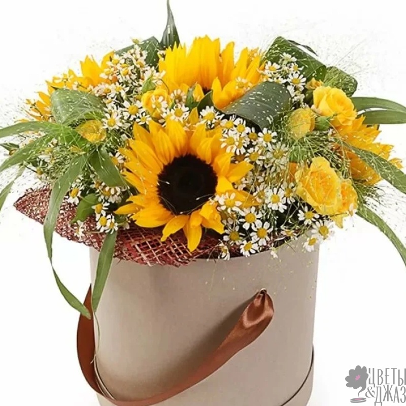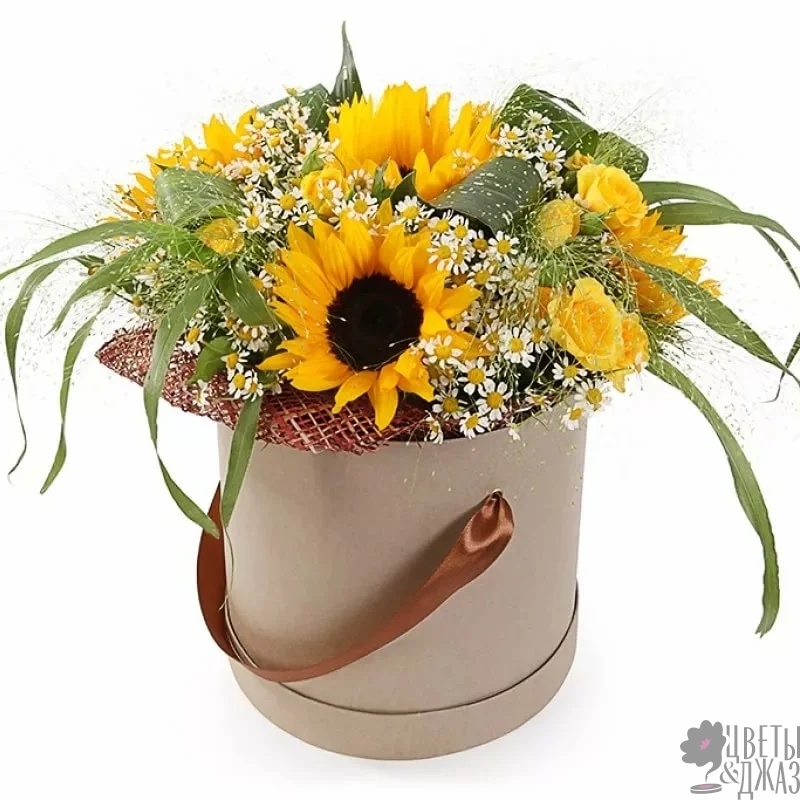 Букет состоит из 5 подсолнухов, 2 желтые кустовые розы, 10 веток танацетума, аспидистра, зелень, коробка, оазис.