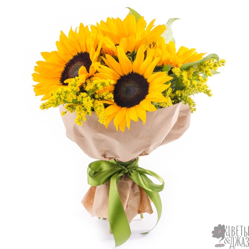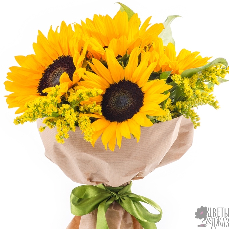 Букет состоит из 5 подсолнухов, 3 солидаго, салал, крафт, атласная лента.