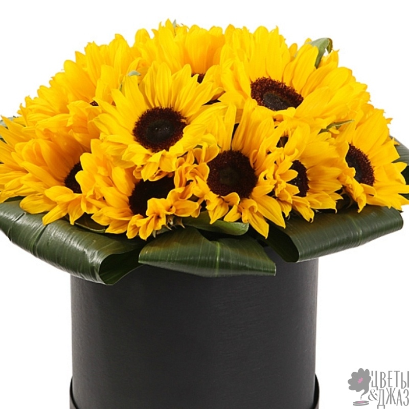 Букет состоит из 15 подсолнухов, аспидистра, коробка, оазис.