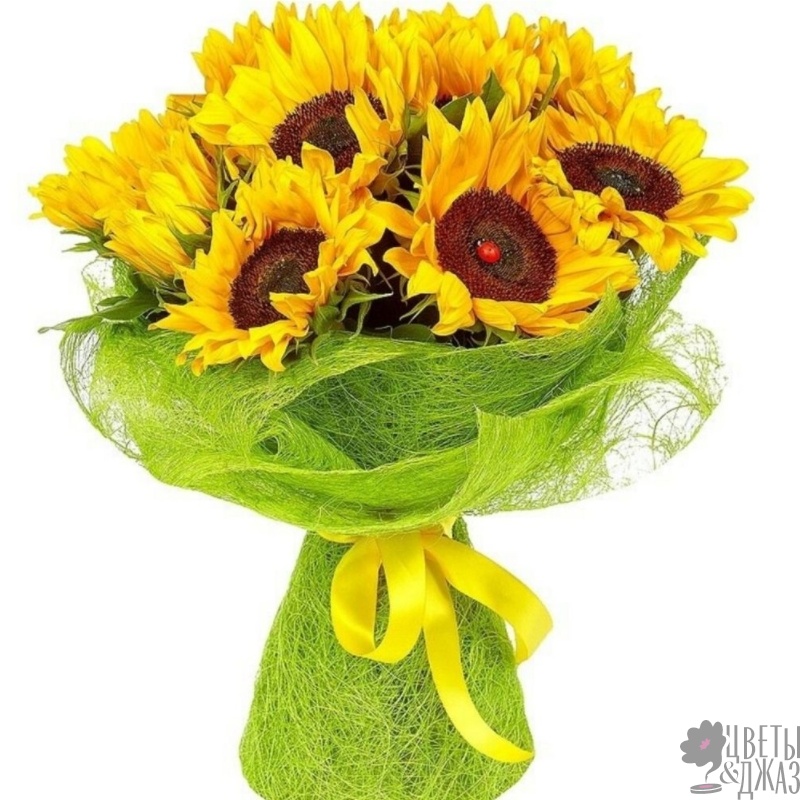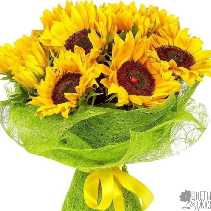Букет состоит из 11 подсолнухов, салал, упаковка, лента.