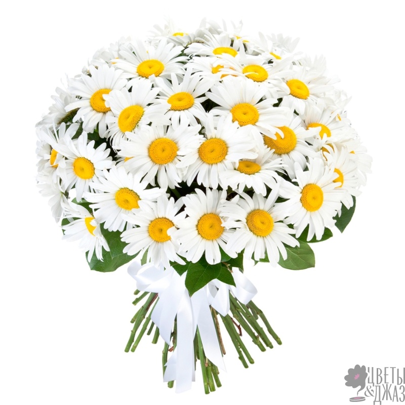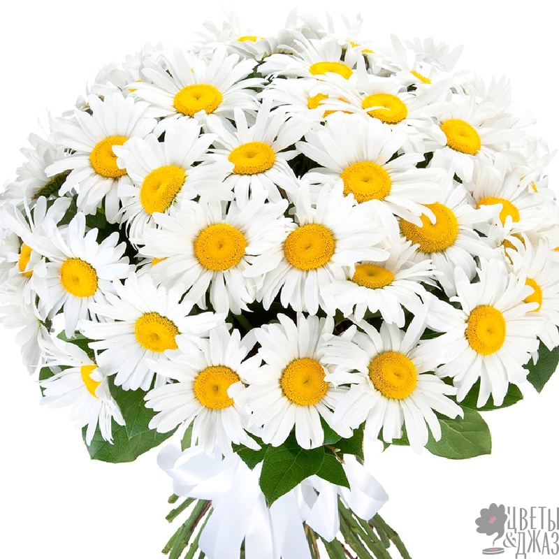 Букет состоит из 55 садовых ромашек, прозрачная упаковка, атласная лента.