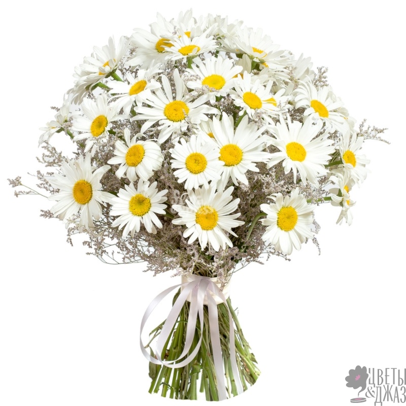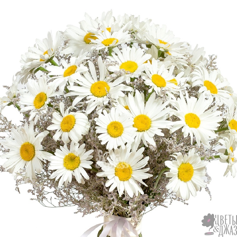 Букет состоит из 35 ромашек, 9 лимониум, прозрачная упаковка, атласная лента.