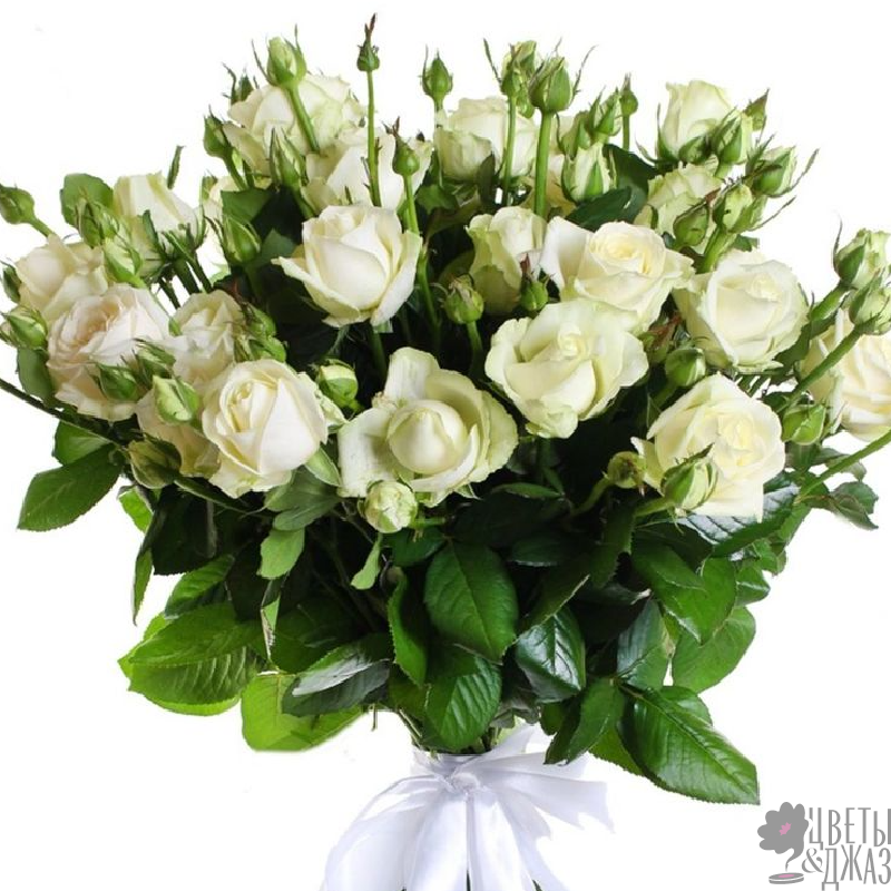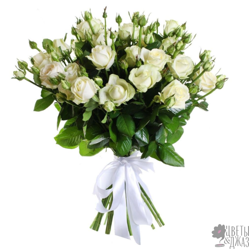 Букет состоит из 17 белых кустовых роз, прозрачная упаковка, атласная лента.
