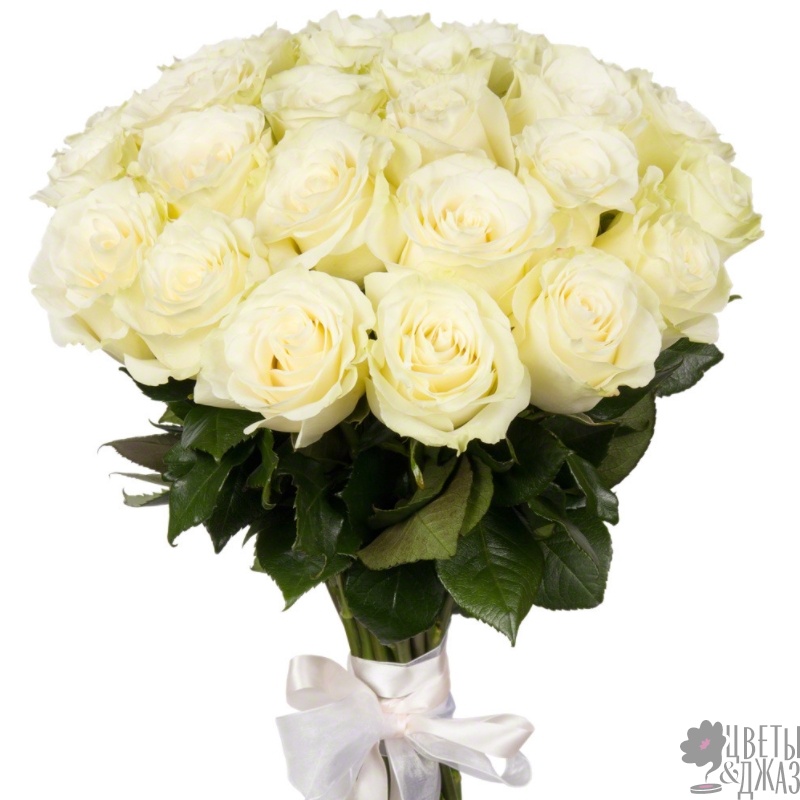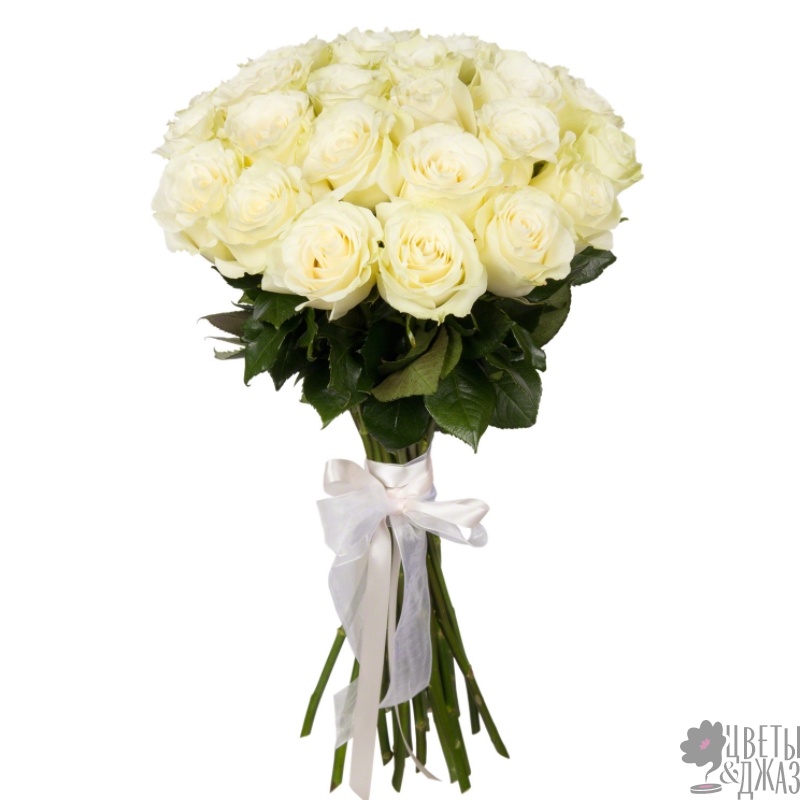 Букет состоит из 21 белая роза, прозрачная упаковка, атласная лента.