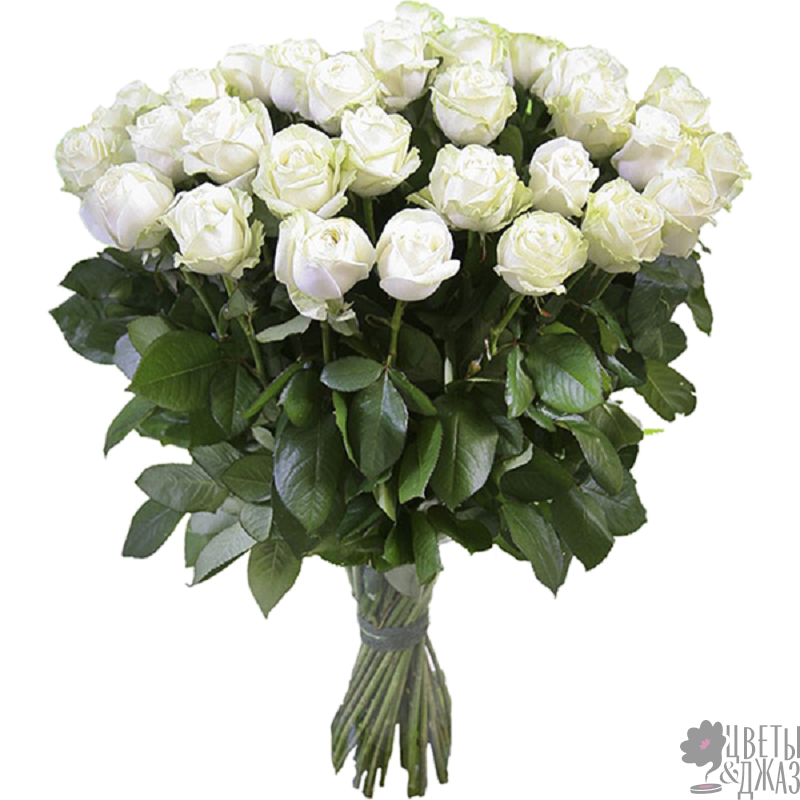 Букет состоит из 31 белая роза, прозрачная упаковка, атласная лента.