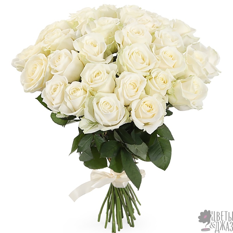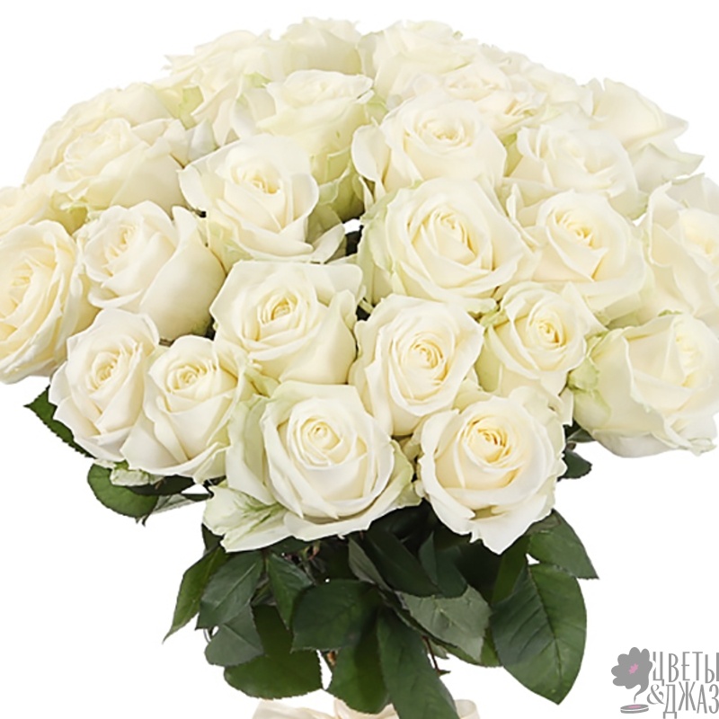 Букет состоит из 35 белых роз, прозрачная упаковка, атласная лента.