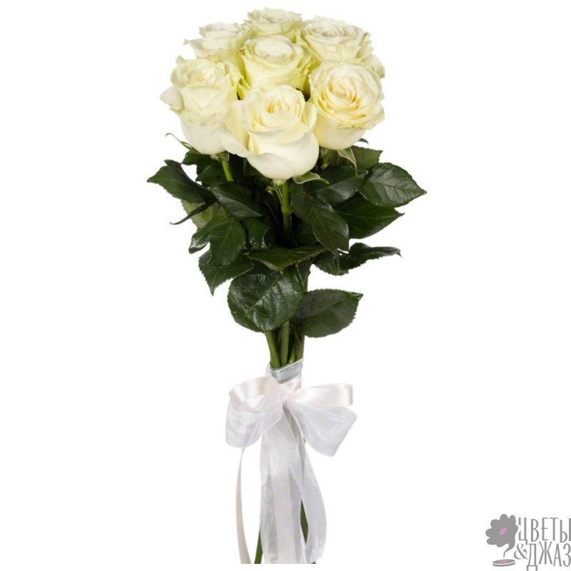 Букет состоит из 7 белых роз, прозрачная упаковка, атласная лента.