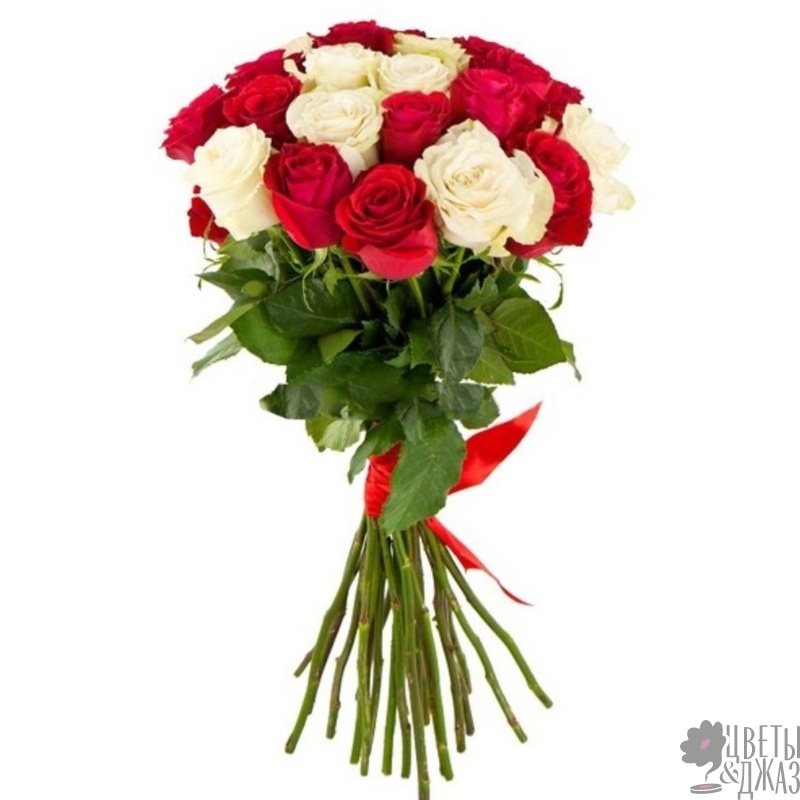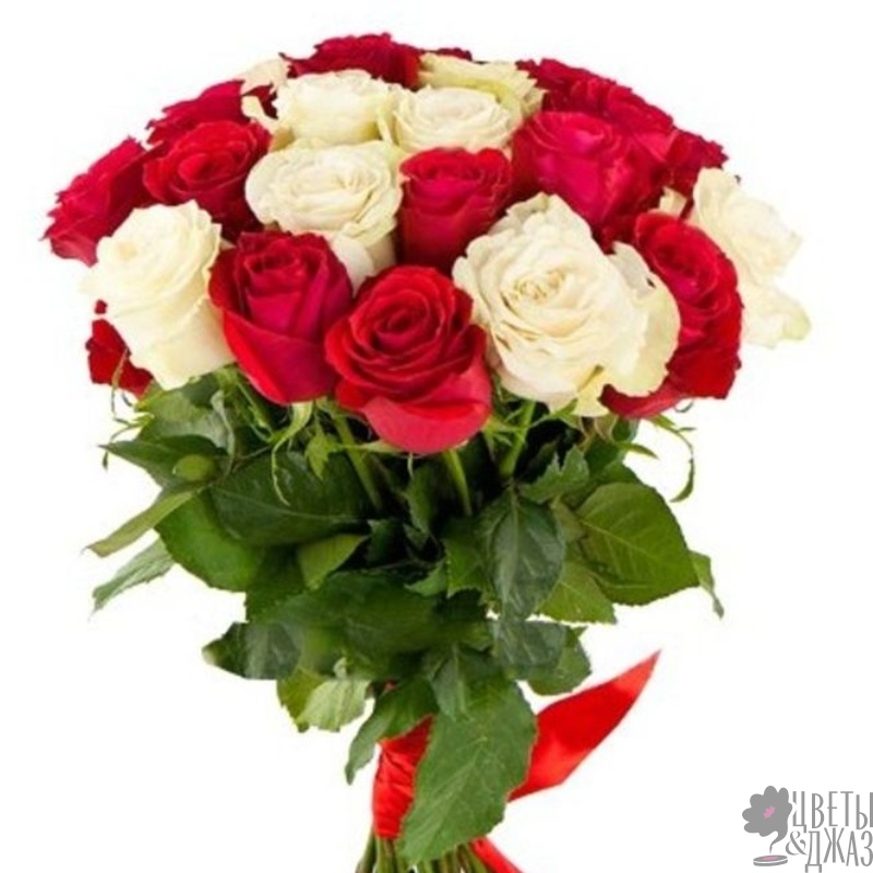 Букет состоит из 10 красных роз, 9 белых роз, прозрачная упаковка, атласная лента.