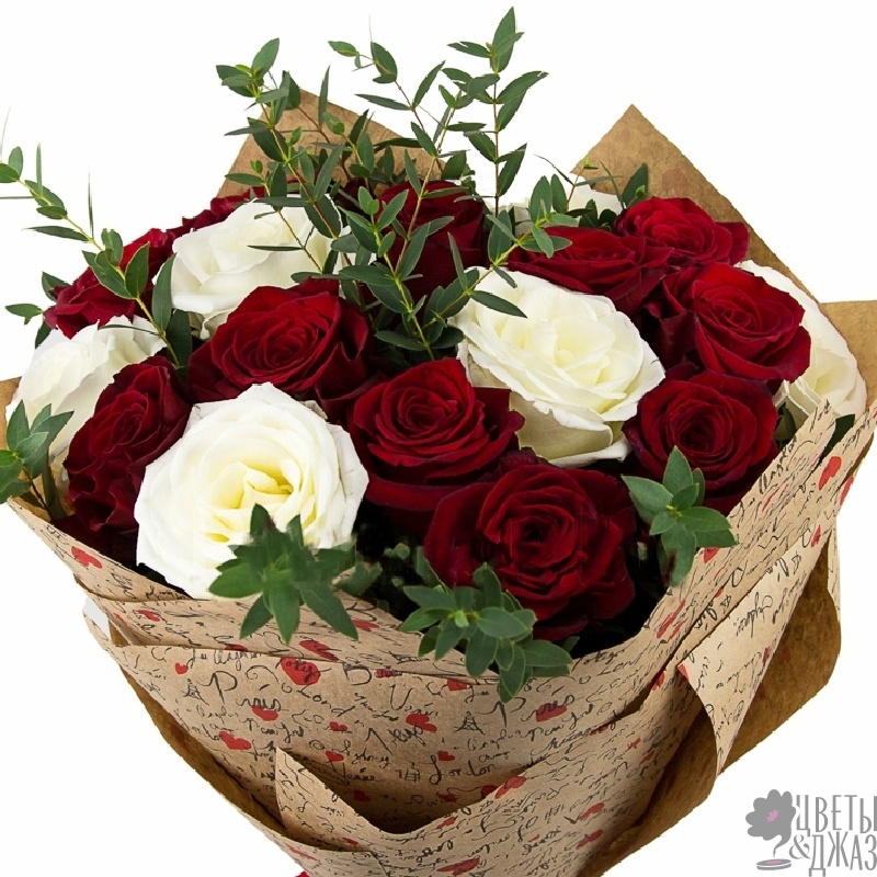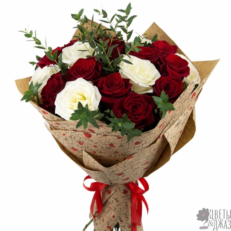 Букет состоит из 11 бордовых роз, 6 белых роз, зелень, крафт, атласная лента.