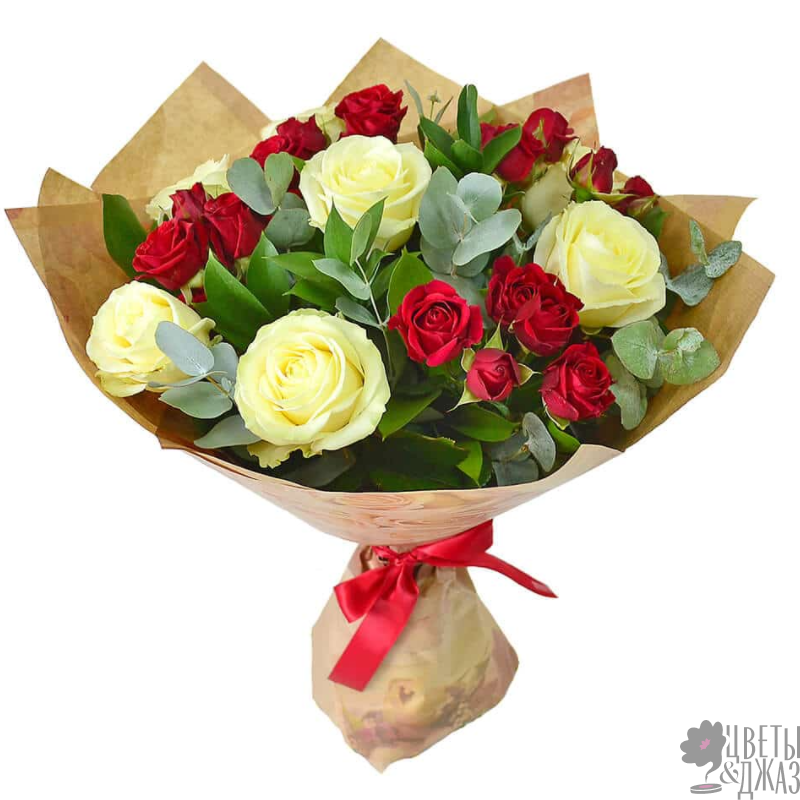 Букет состоит из 7 белых роз, 4 ветки красных кустовых роз, эвкалипт, крафт, атласная лента.