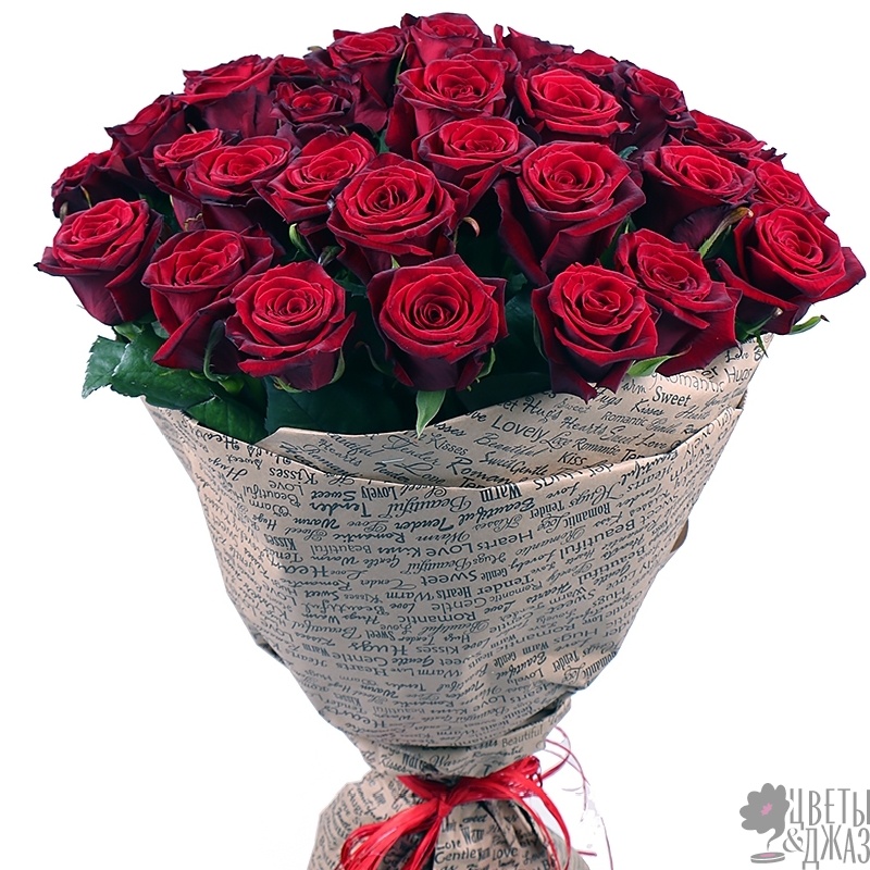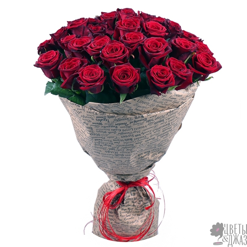 Букет состоит из 35 бордовых роз, крафт, атласная лента.