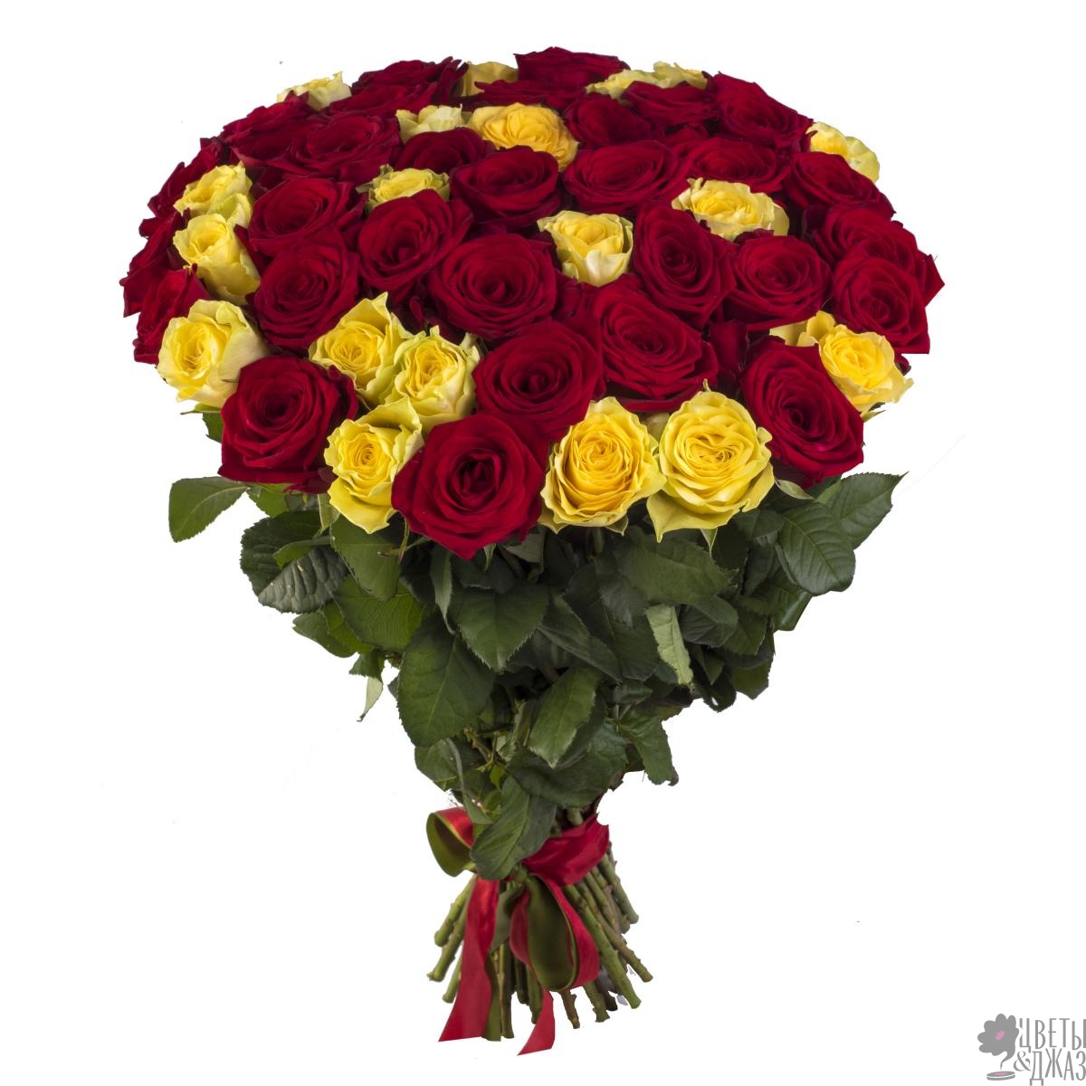 Букет состоит из 23 бордовые розы, 22 желтые розы, прозрачная упаковка, атласная лента.