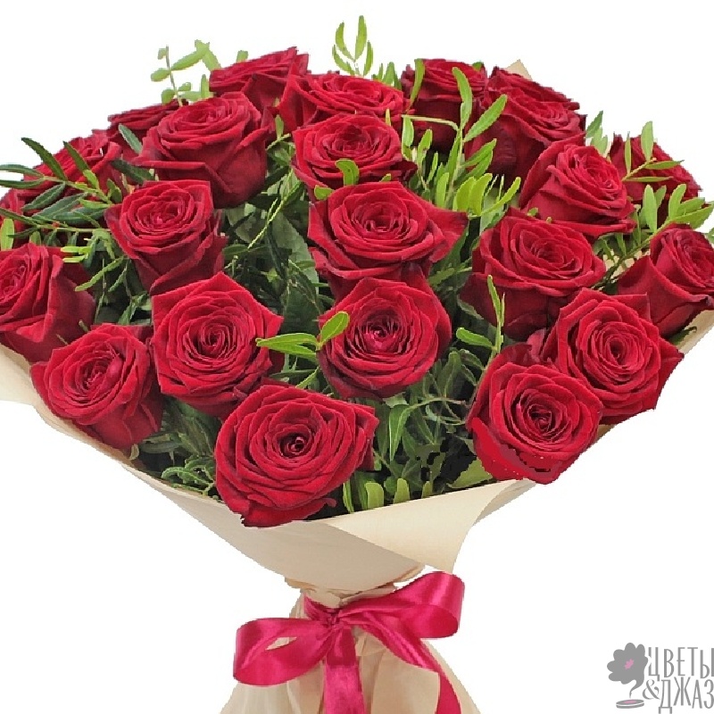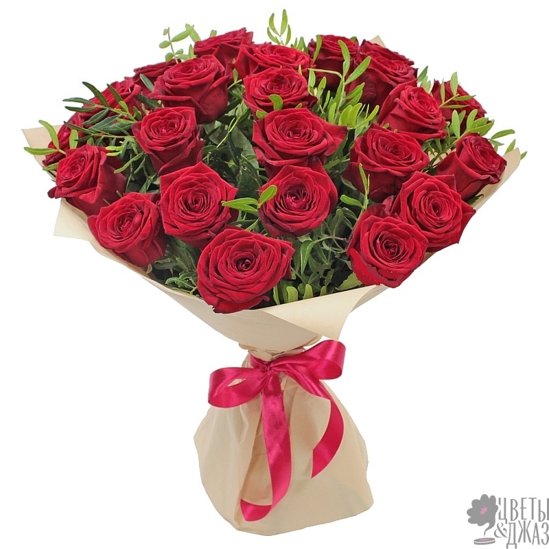 Букет состоит из 25 роз, писташ, крафт, атласная лента.
