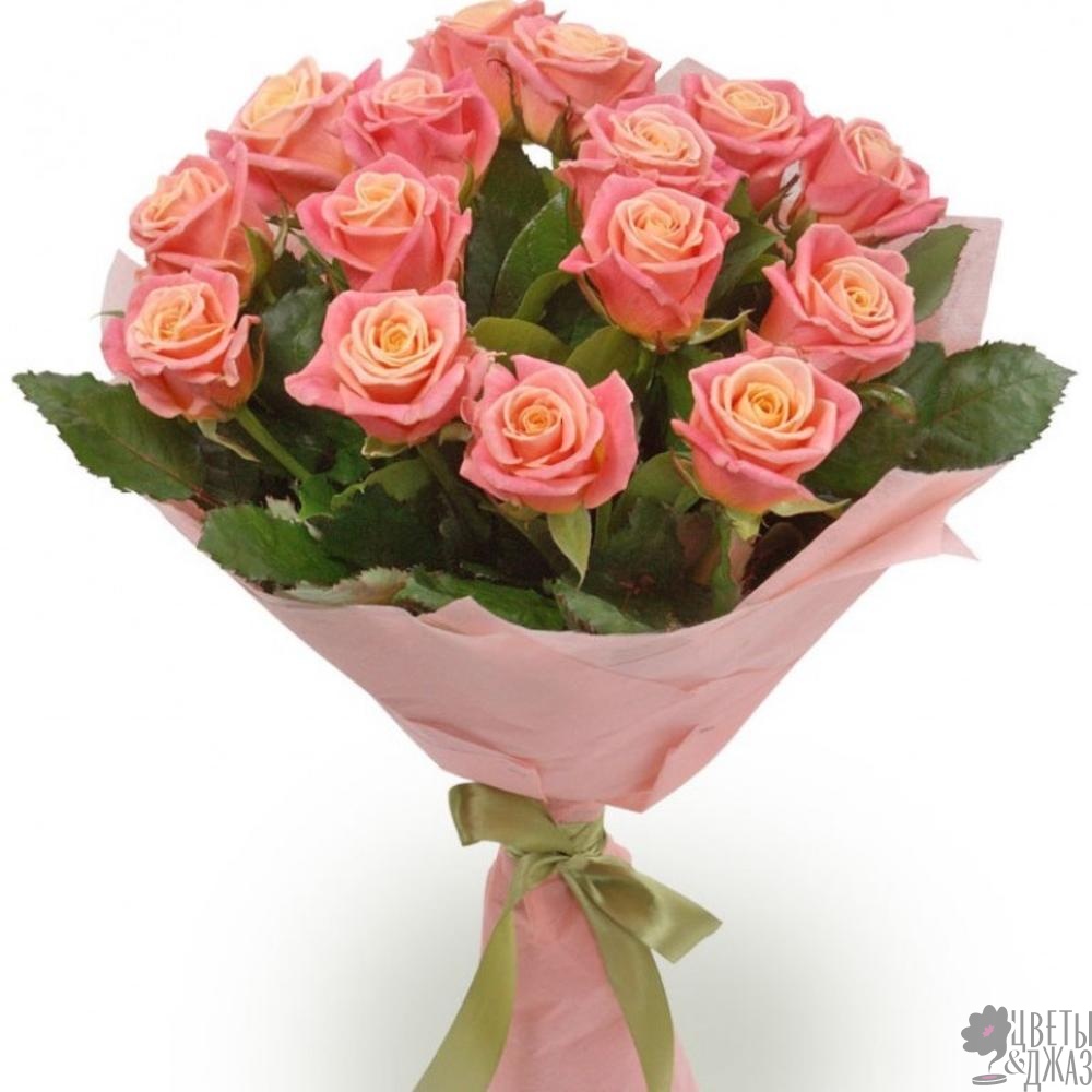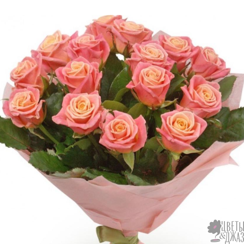 Букет состоит из 19 розовых роз, упаковка, лента.