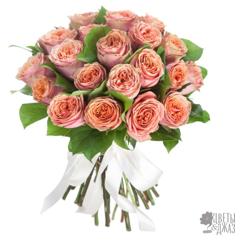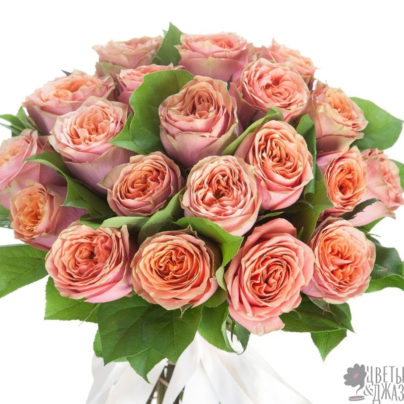 Букет состоит из 21 пионовидная роза, салал, прозрачная упаковка, атласная лента.