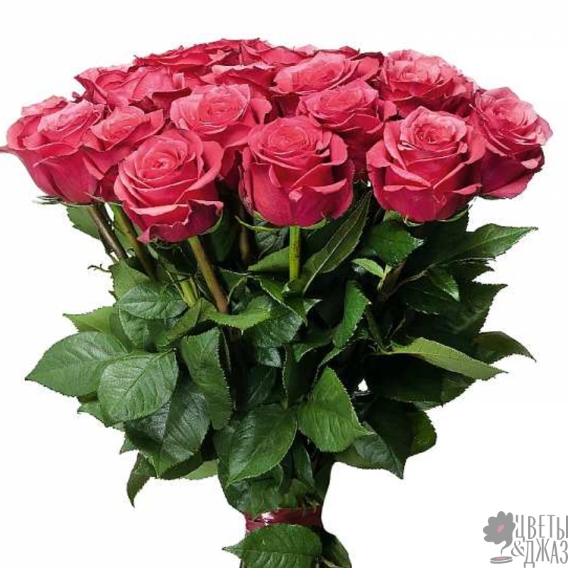Букет состоит из 25 малиновых роз, прозрачная упаковка, атласная лента.