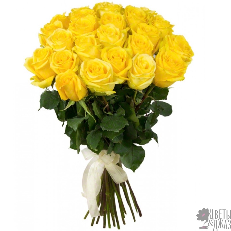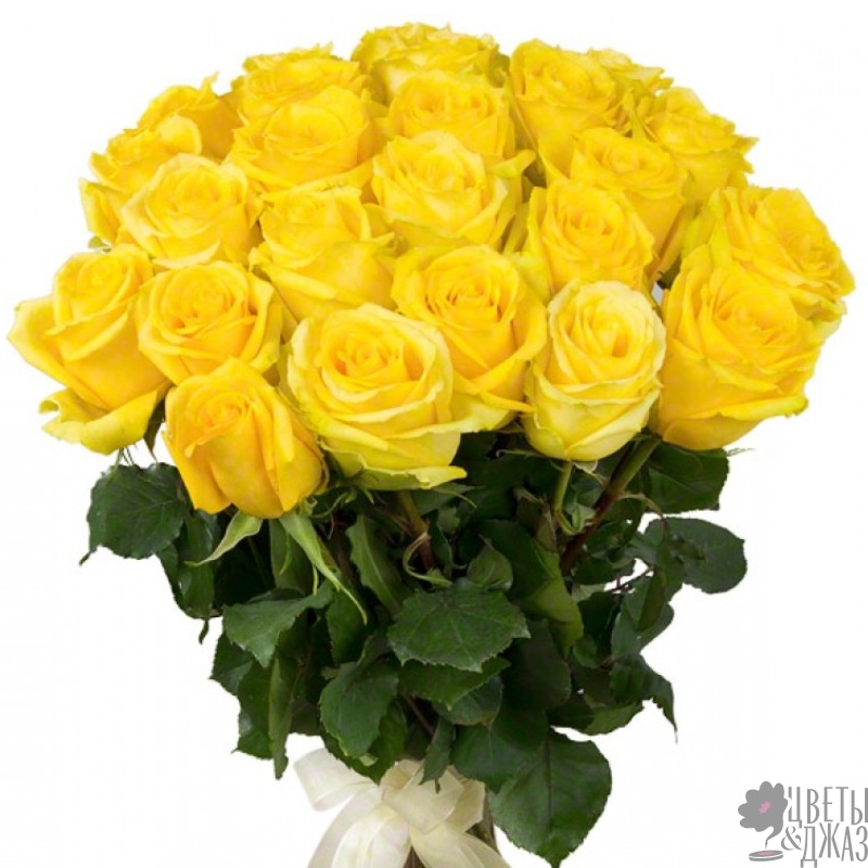 Букет состоит из 25 желтых роз, прозрачная упаковка, атласная лента.