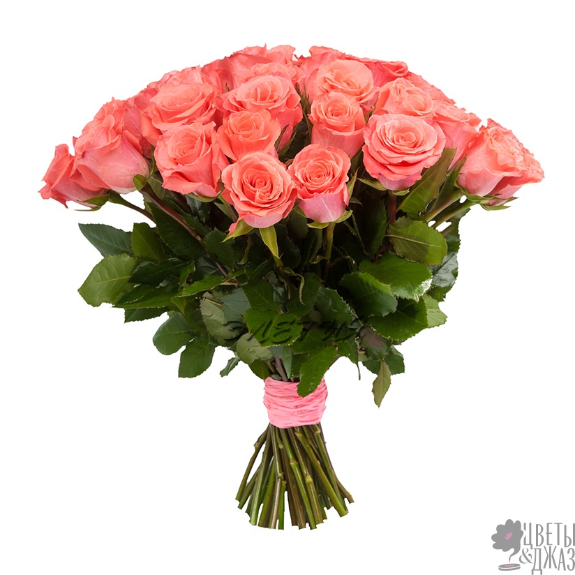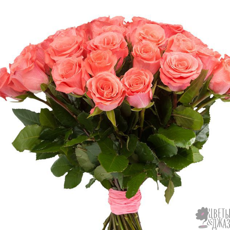 Букет состоит из 31 коралловая роза, прозрачная упаковка, атласная лента.