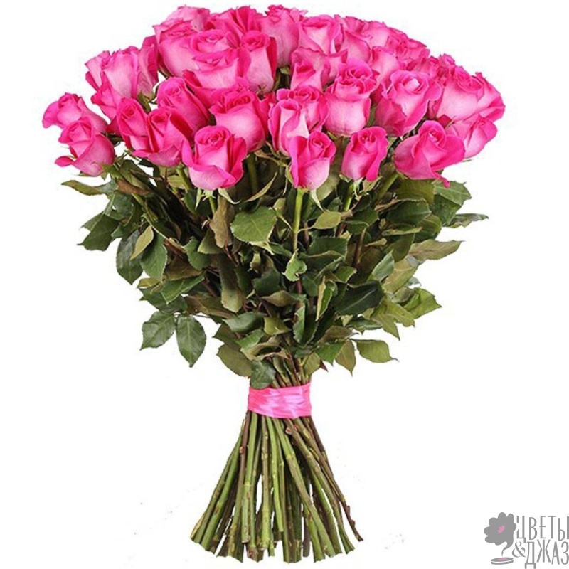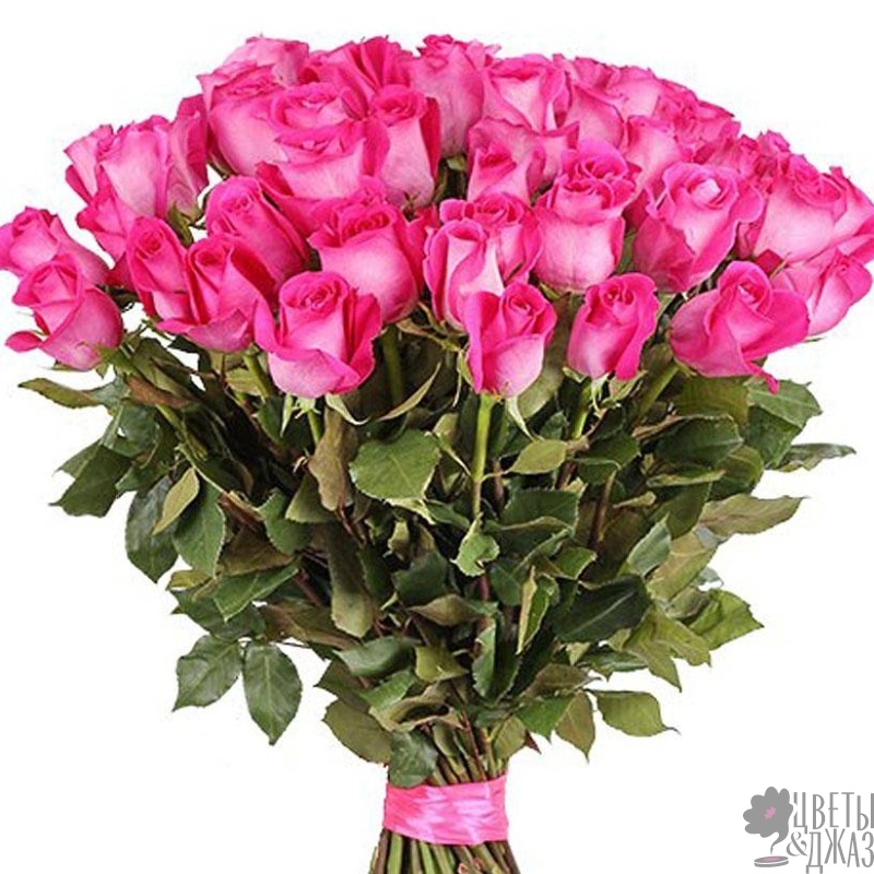 Букет состоит из 35 малиновых роз, прозрачная упаковка, атласная лента.