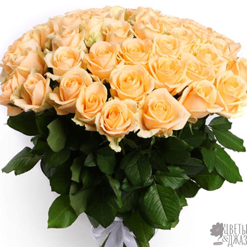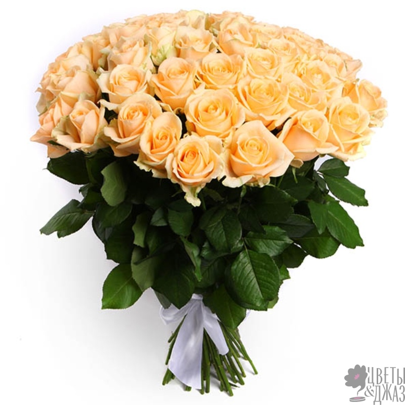 Букет состоит из 55 кремовых роз, прозрачная упаковка, атласная лента.