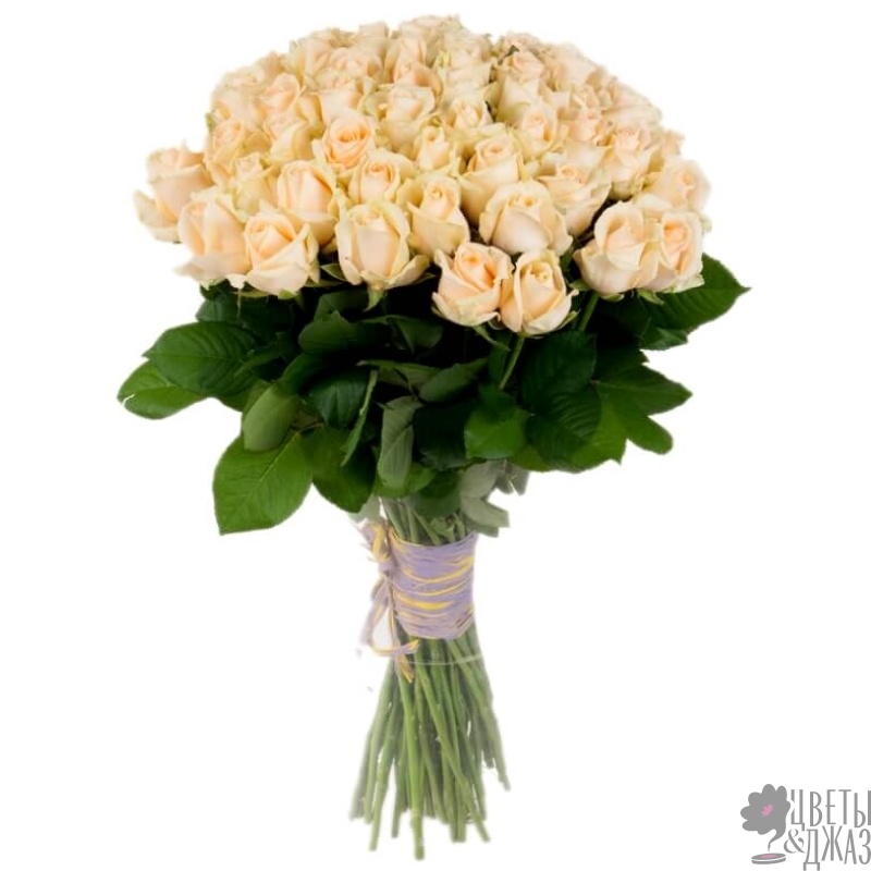 Букет состоит из 55 кремовых роз, прозрачная упаковка, атласная лента.