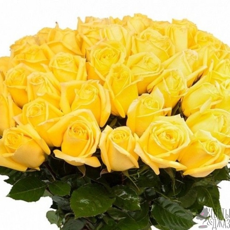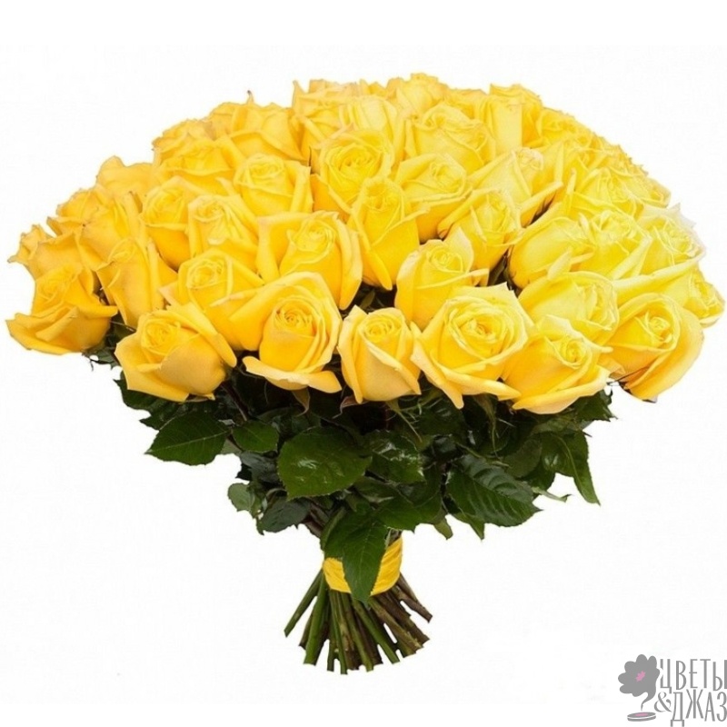 Букет состоит из 55 желтых роз, прозрачная упаковка, атласная лента.
