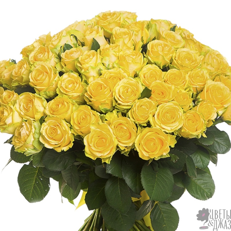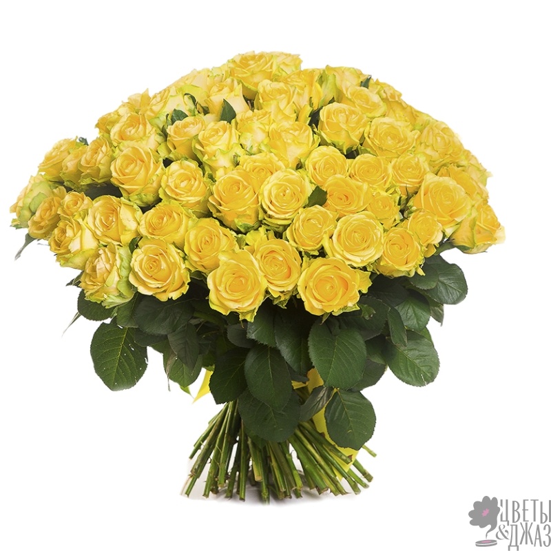 Букет состоит из 55 желтых роз, прозрачная упаковка, желтая лента.