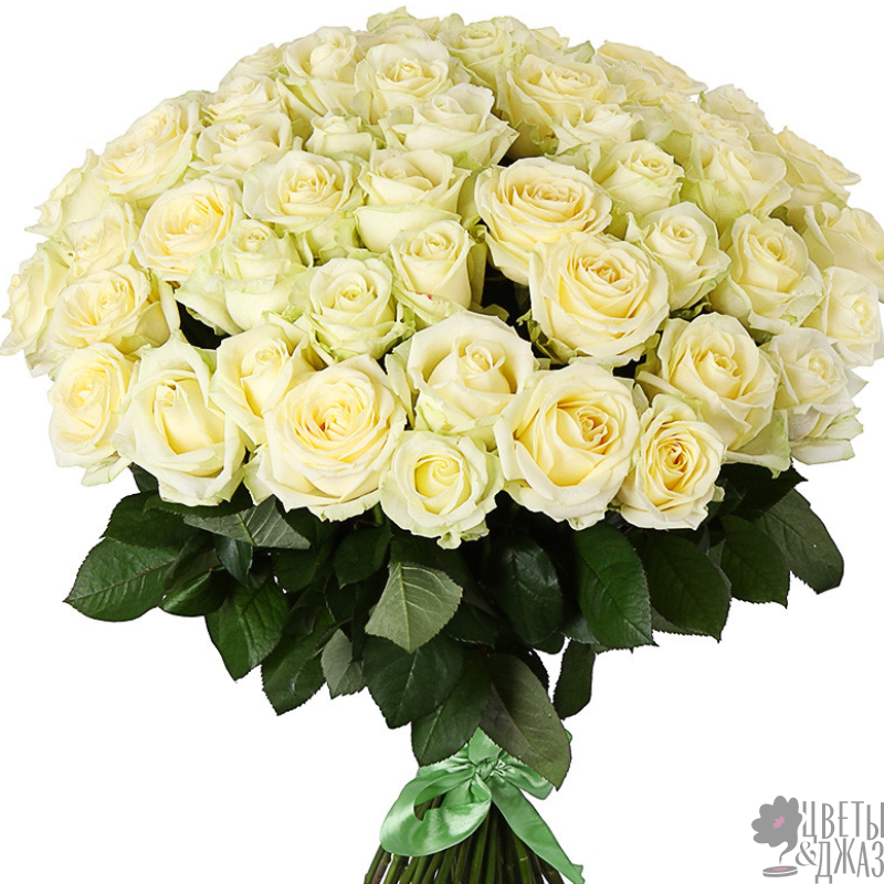 Букет состоит из 75 белых роз, прозрачная упаковка, атласная лента.