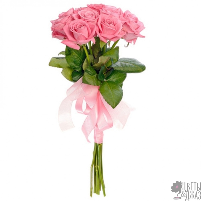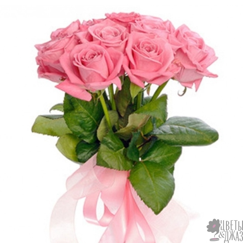 Букет состоит из 7 розовых роз, прозрачная упаковка, атласная лента.
