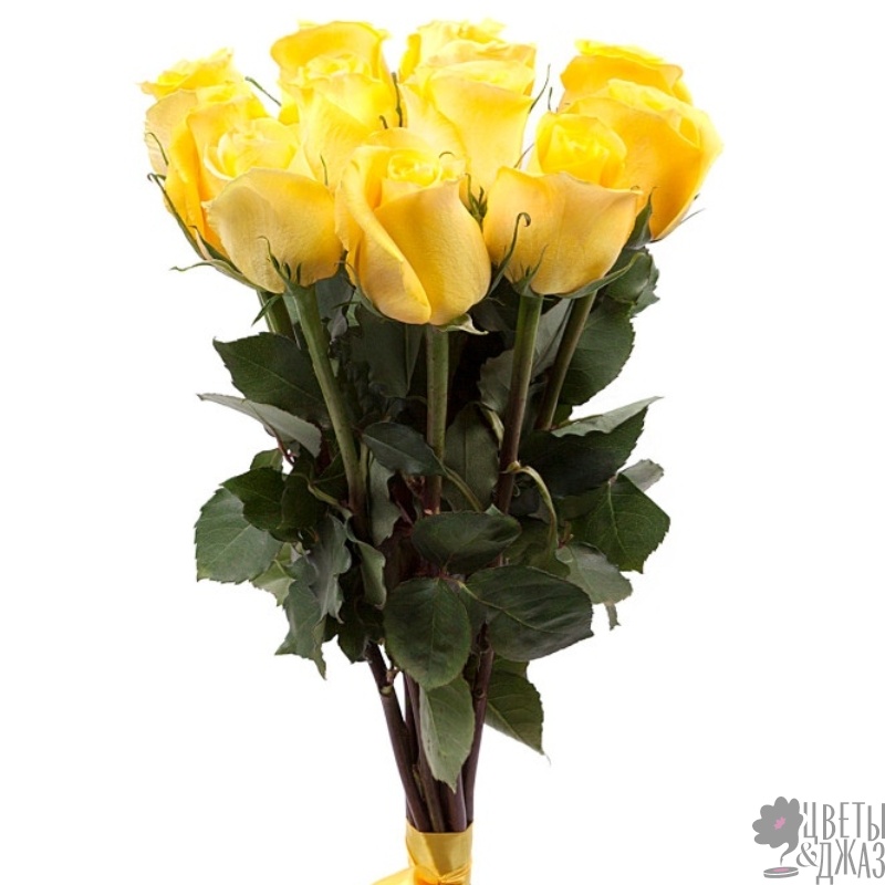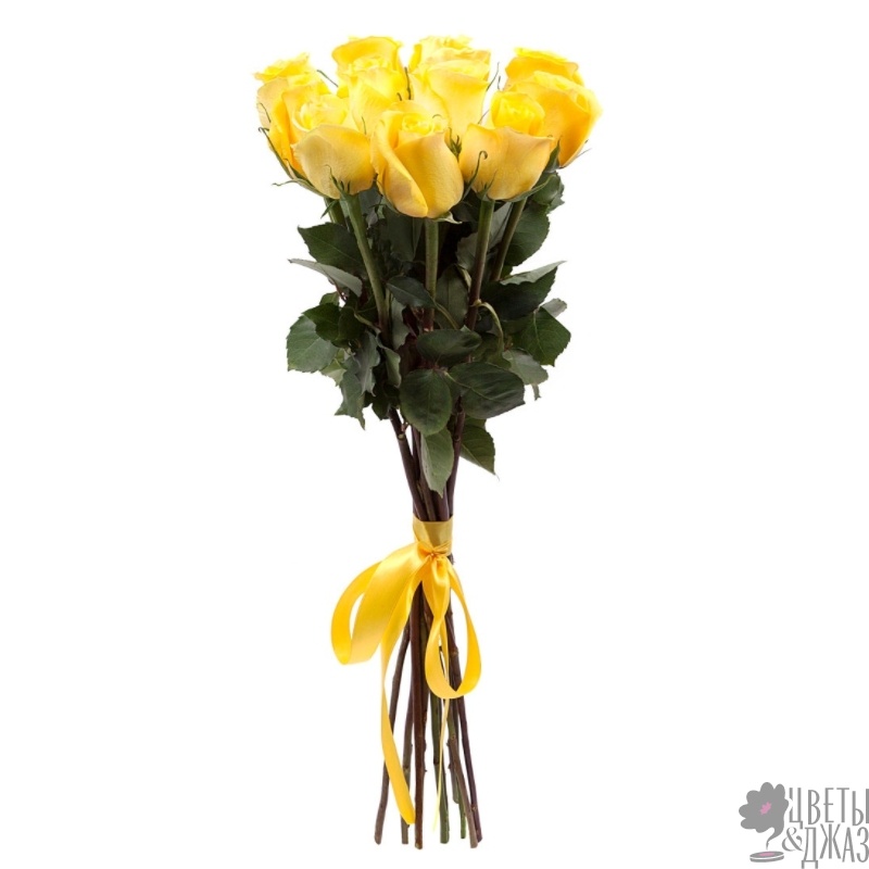 Букет состоит из 7 желтых роз, прозрачная упаковка, атласная лента.