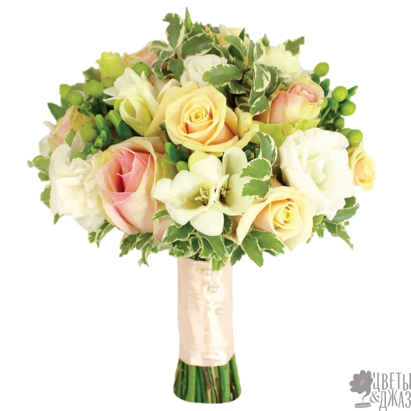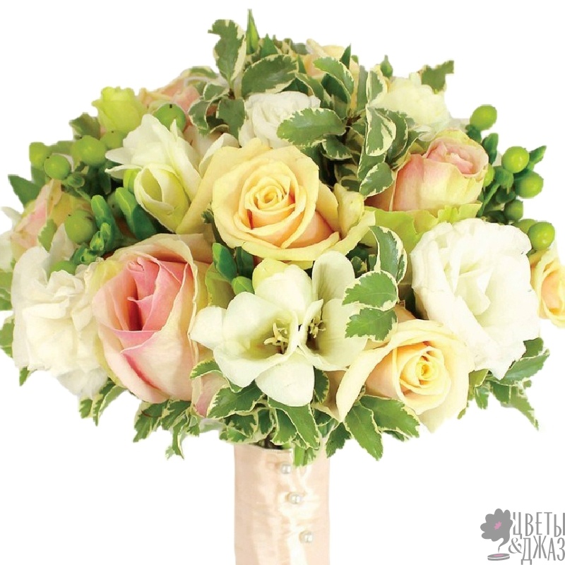 Букет состоит из 15 роз, 6 фрезий, 2 ветки эустомы, зелень, атласная лента.