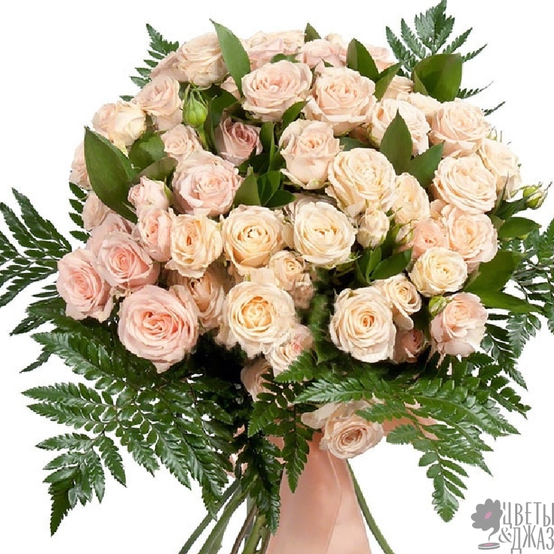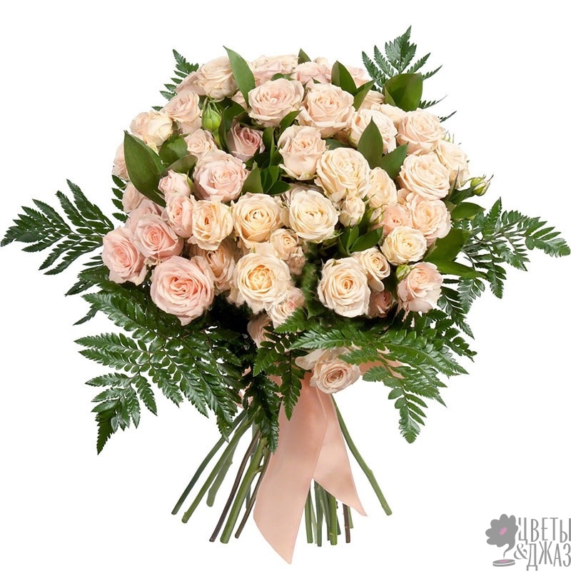 Букет состоит из 11 кремовых кустовых пионовидных роз, зелень, прозрачная упаковка, атласная лента.