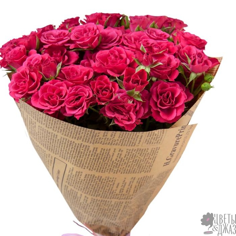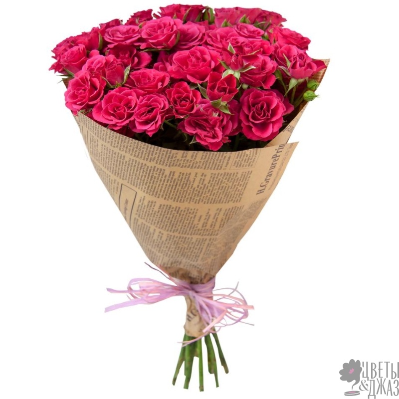 Букет состоит из 17 веток малиновых кустовых роз, крафт, атласная лента.