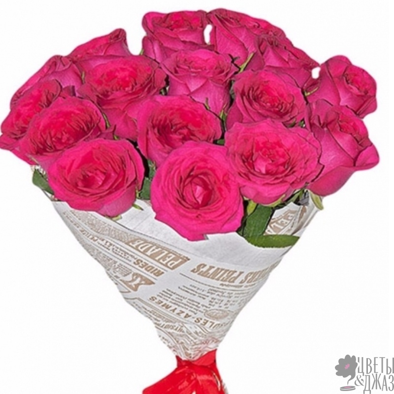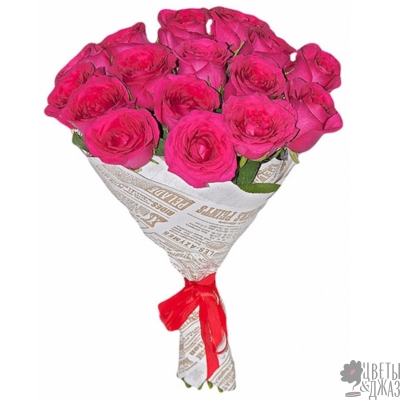 Букет состоит из 15 малиновых роз, крафт, атласная лента.