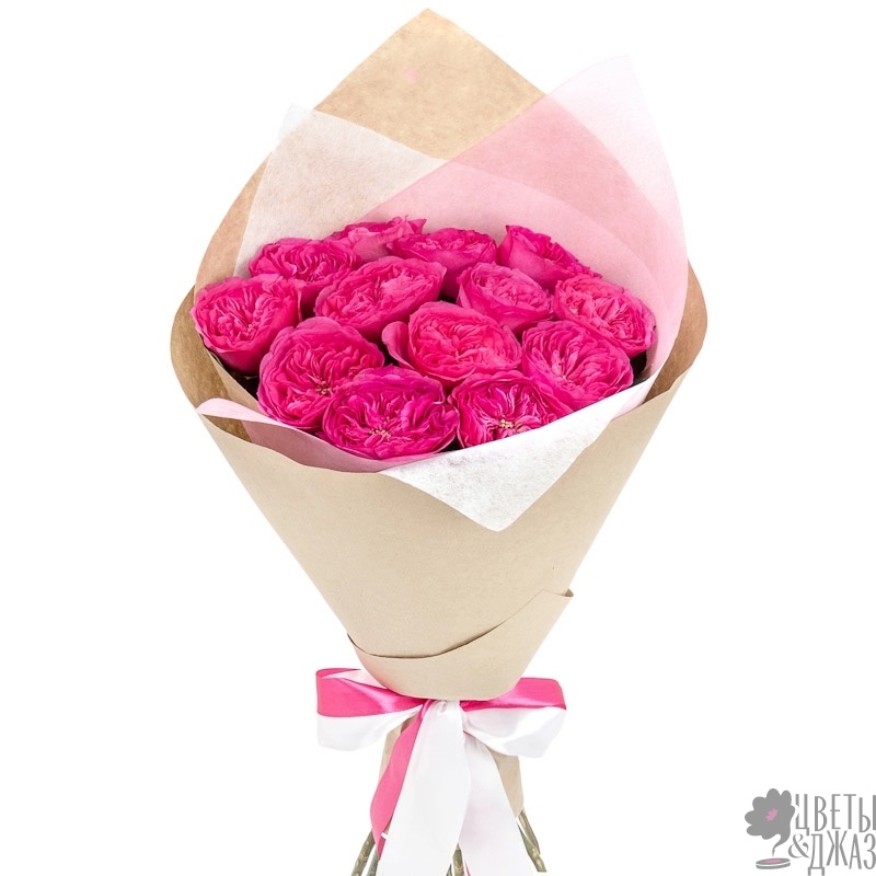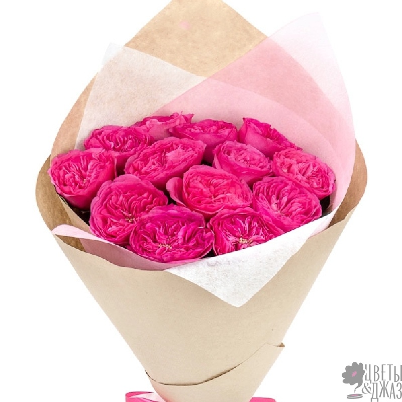 Букет состоит из 13 пионовидных роз, крафт, атласная лента.