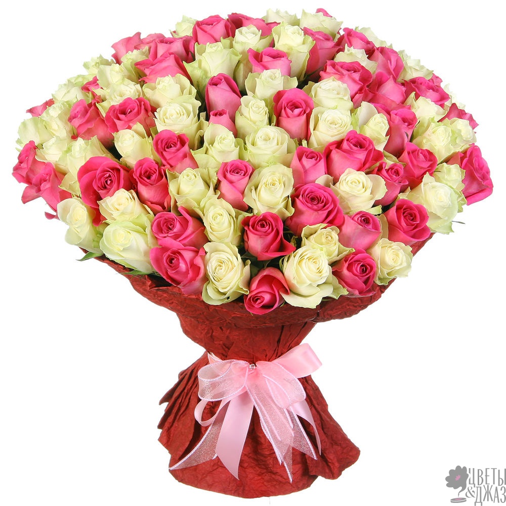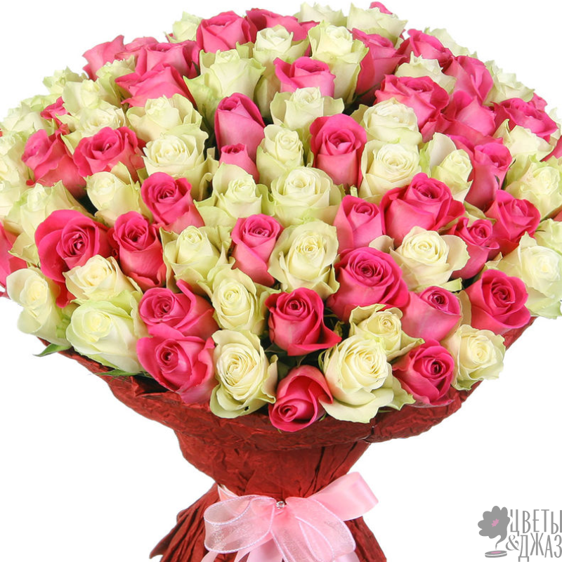 Букет состоит из 50 белых роз, 51 розовая роза, розовая упаковка, розовая лента.
