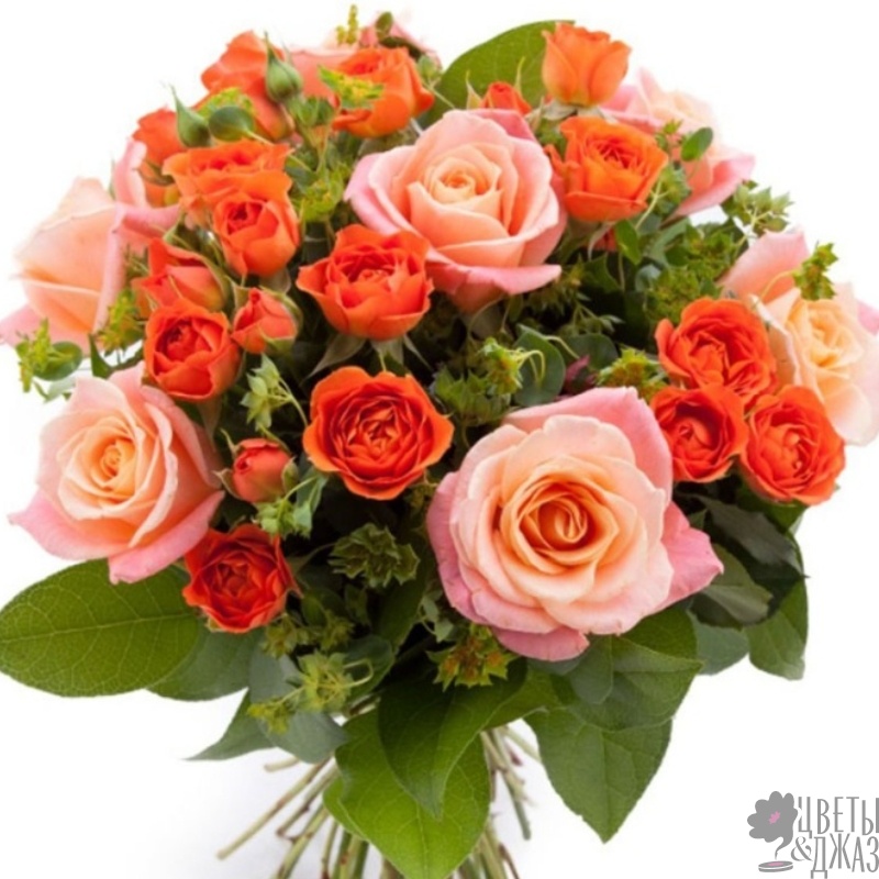 Букет состоит из 11 розовых роз, 14 оранжевых кустовых роз, зелень, прозрачная упаковка, атласная лента.