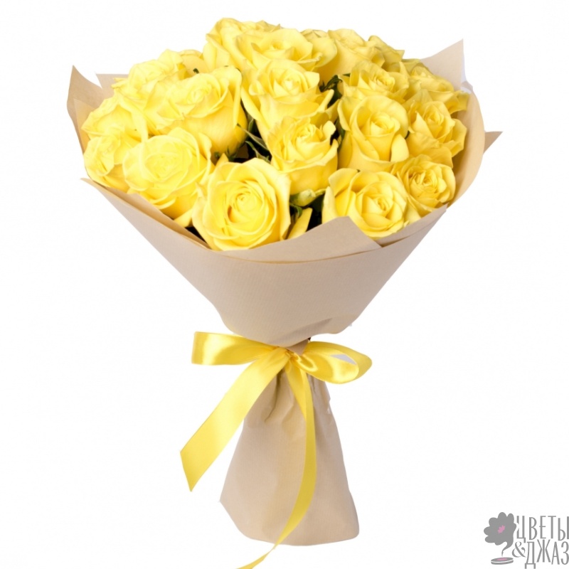 Букет состоит из 21 желтая роза, крафт, желтая лента.