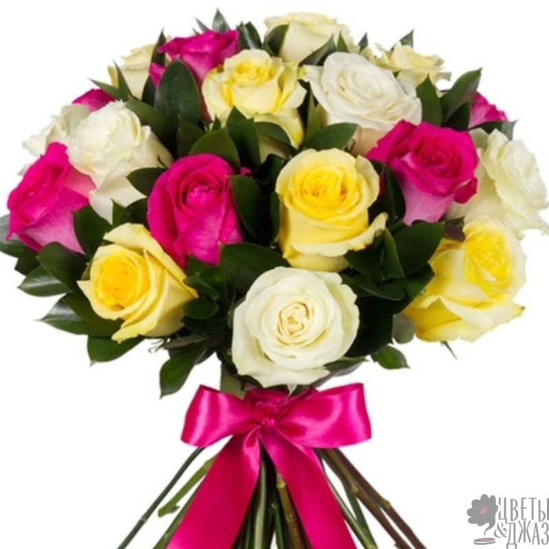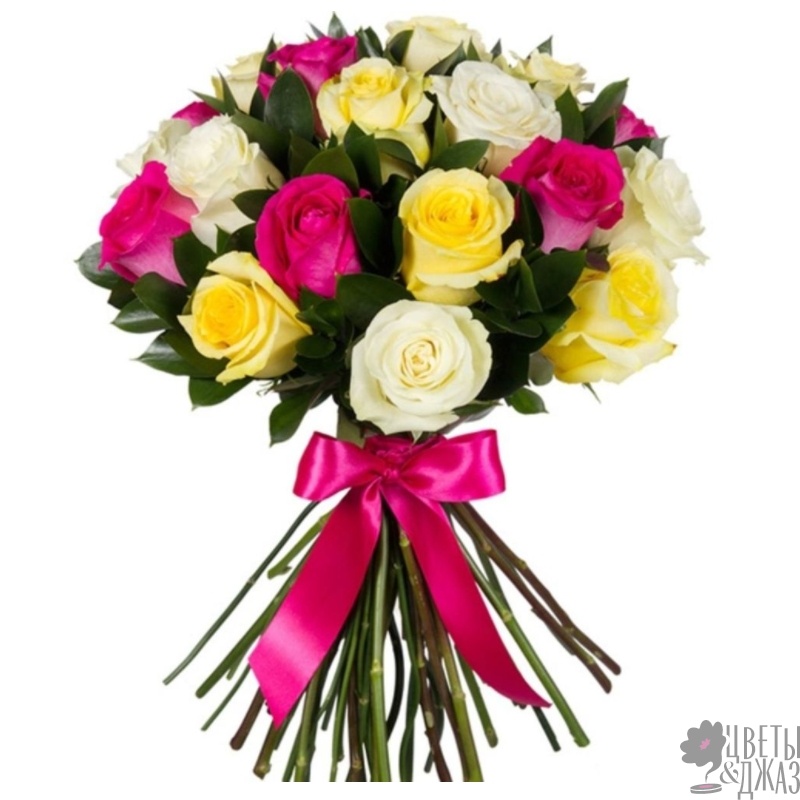 Букет состоит из MIX из 19 роз, прозрачная упаковка, атласная лента.