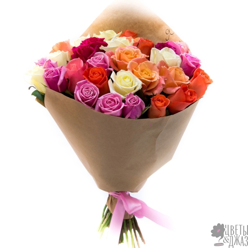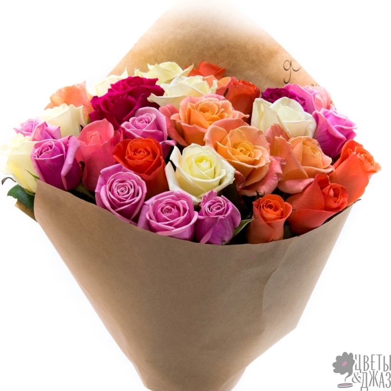 Букет состоит из MIX из 35 роз, крафт, атласная лента.