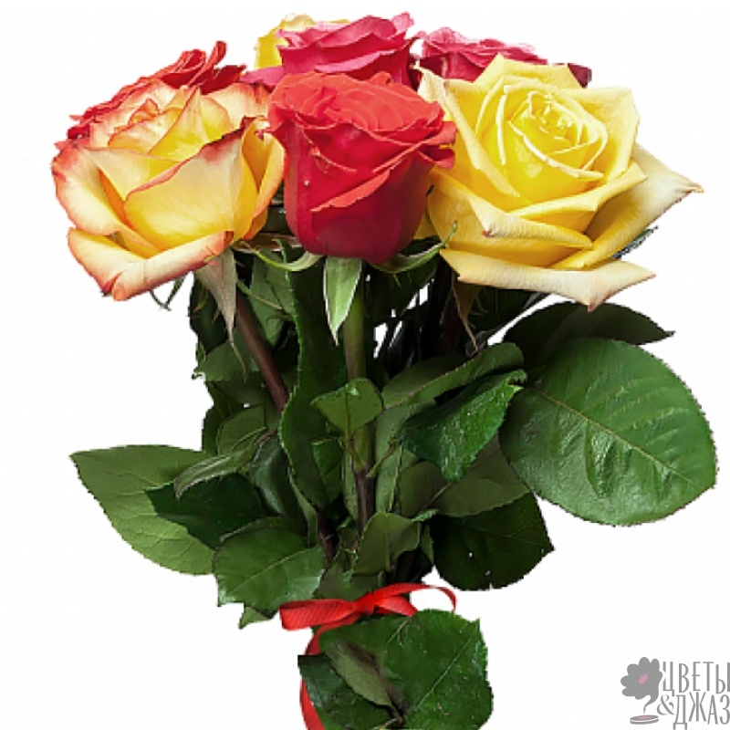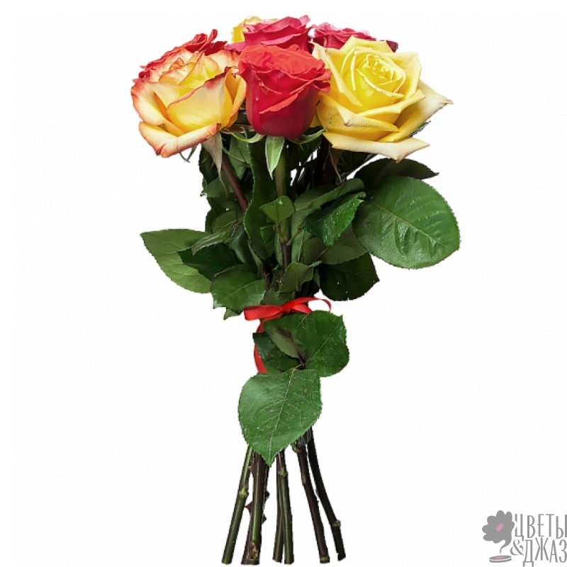 Букет состоит из 2 красные розы, 2 розовые розы, 3 желтые розы, прозрачная упаковка, атласная лента.