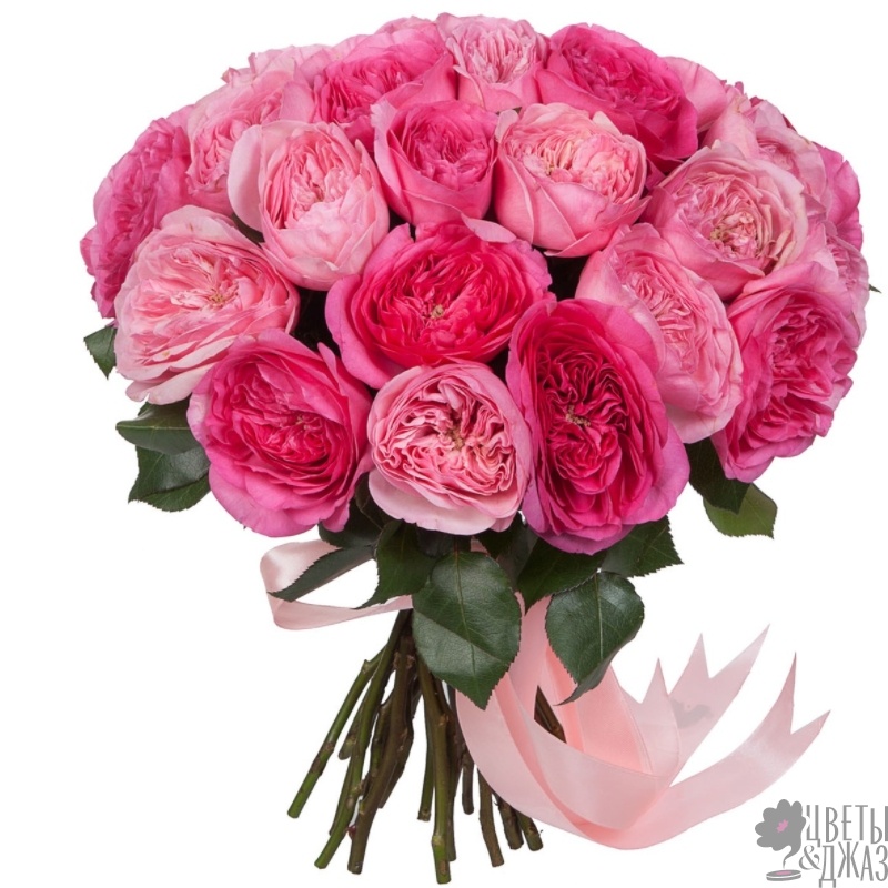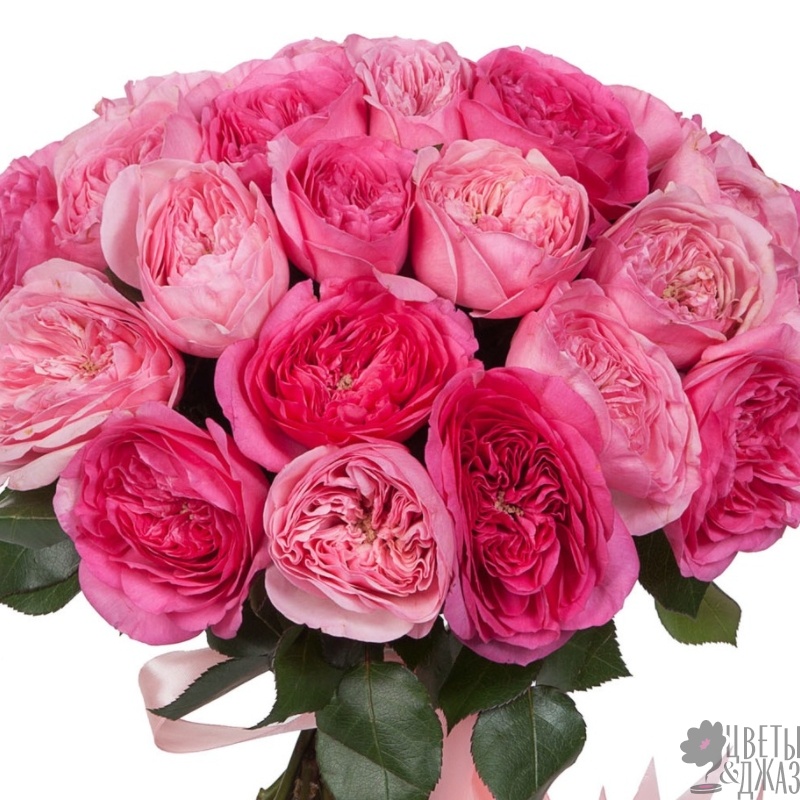 Букет состоит из MIX из 25 пионовидных роз, прозрачная упаковка, атласная лента.
