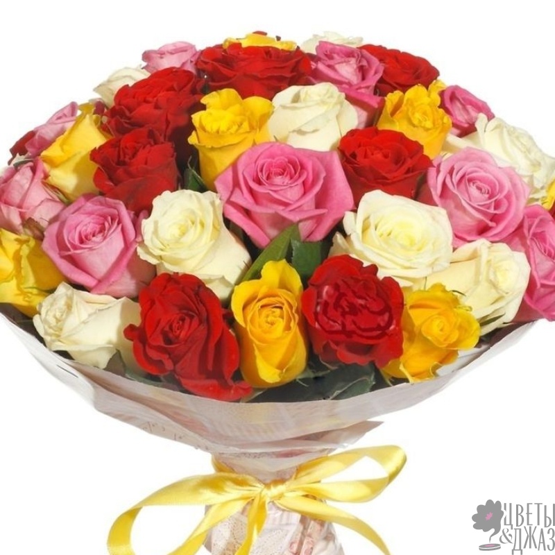 Букет состоит из 9 желтых роз, 9 красных роз, 9 розовых роз, 8 белых роз, красивая упаковка.