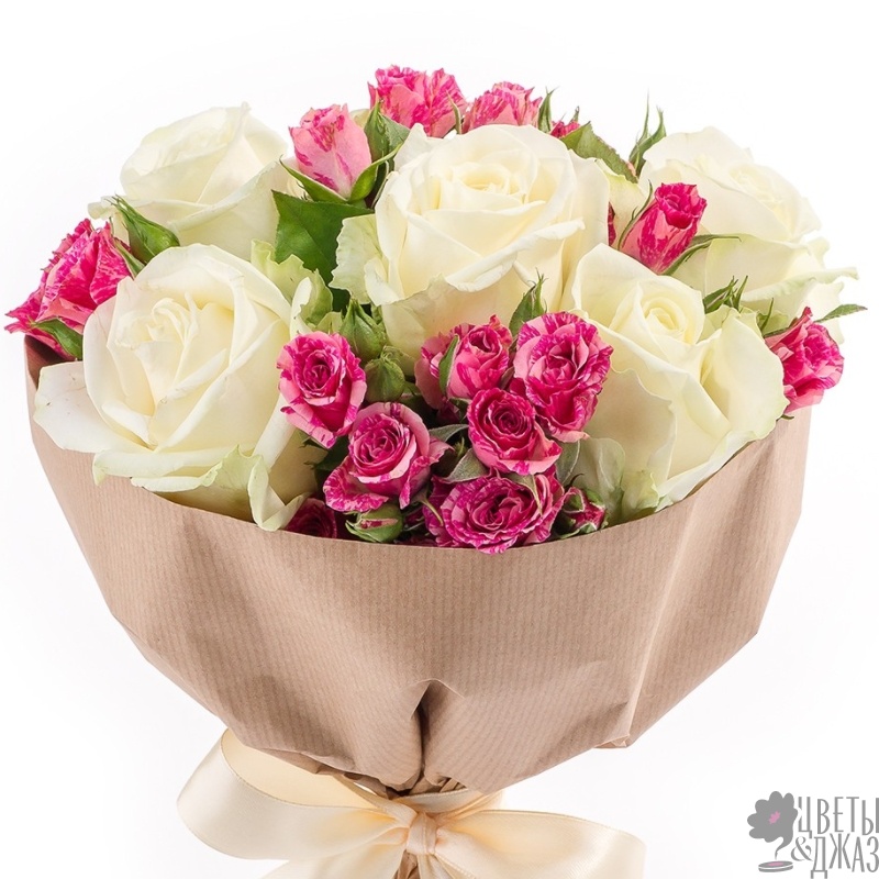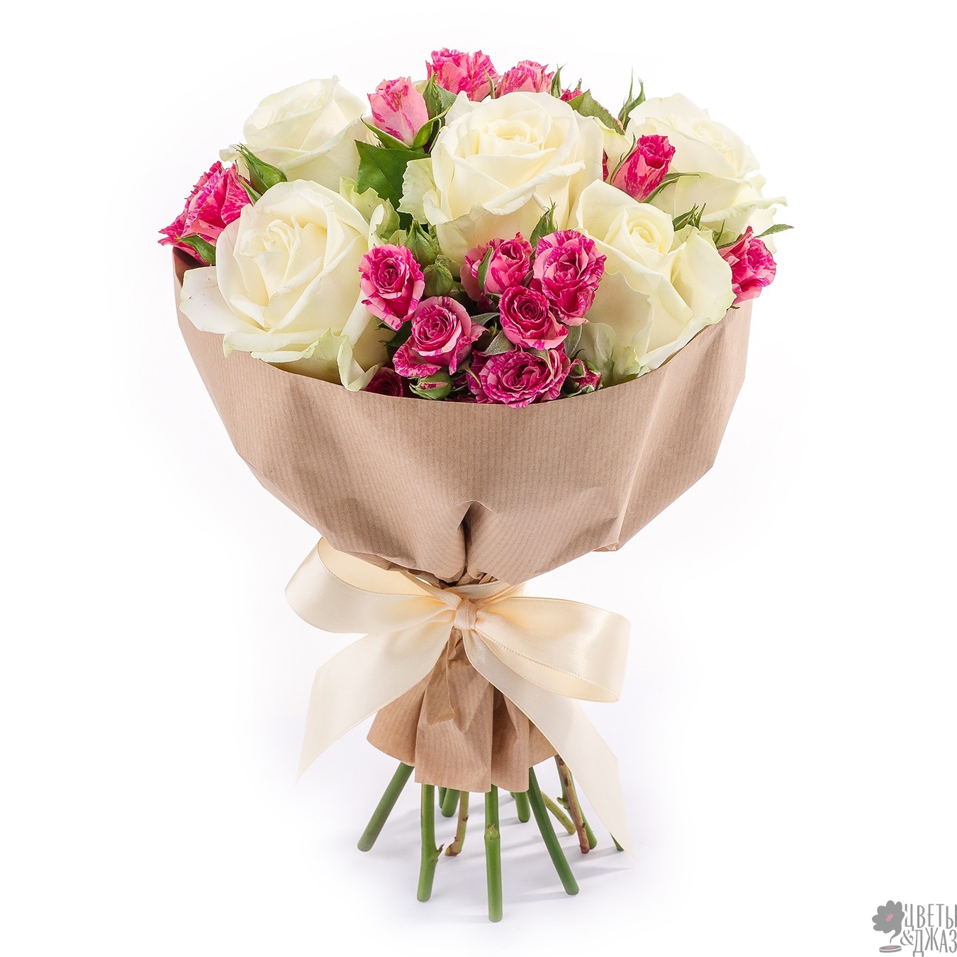 Букет состоит из 5 белых роз, 4 ветки красной кустовой розы, крафт, атласная лента.