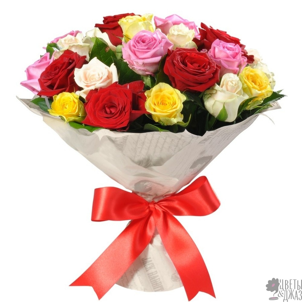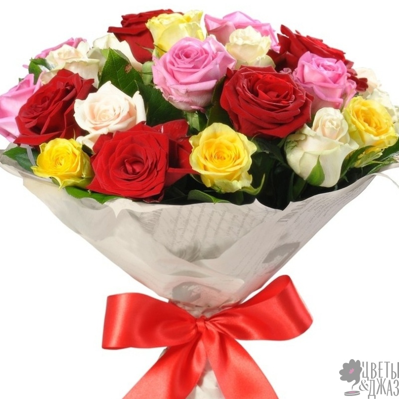 Букет состоит из 6 красных роз, 5 белых роз, 5 желтых роз, 5 розовых роз, крафт, красная лента.