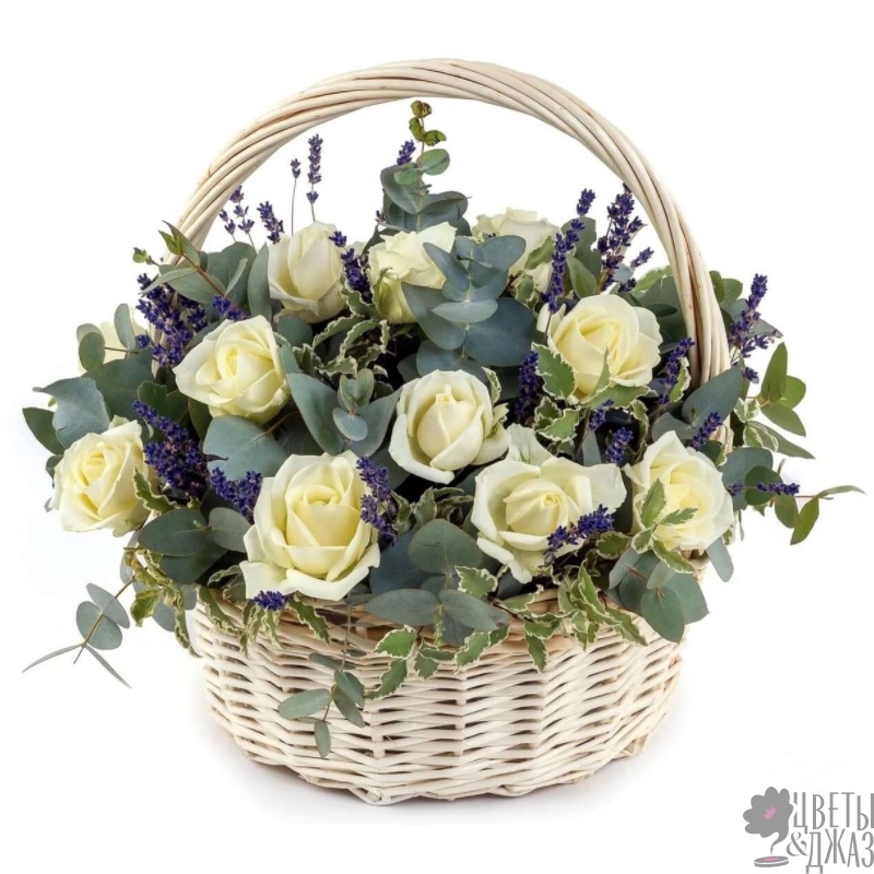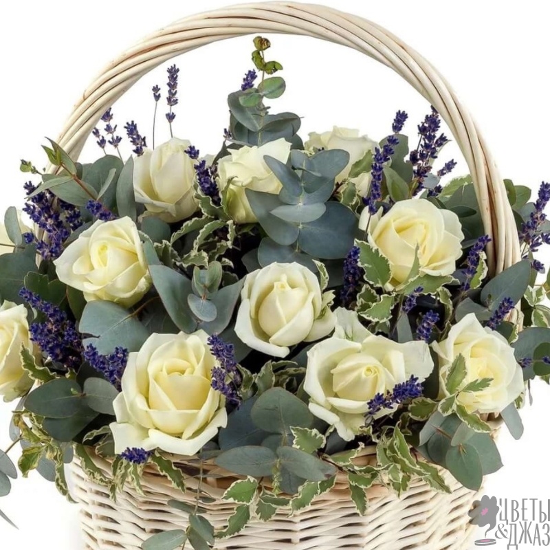 Корзина из белых роз с лавандой