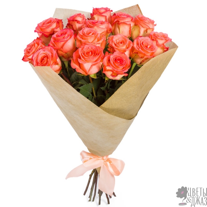 Букет из 15 коралловых роз в крафте