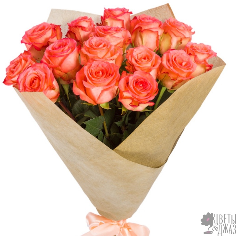 Букет состоит из 15 коралловых роз, крафт, атласная лента.